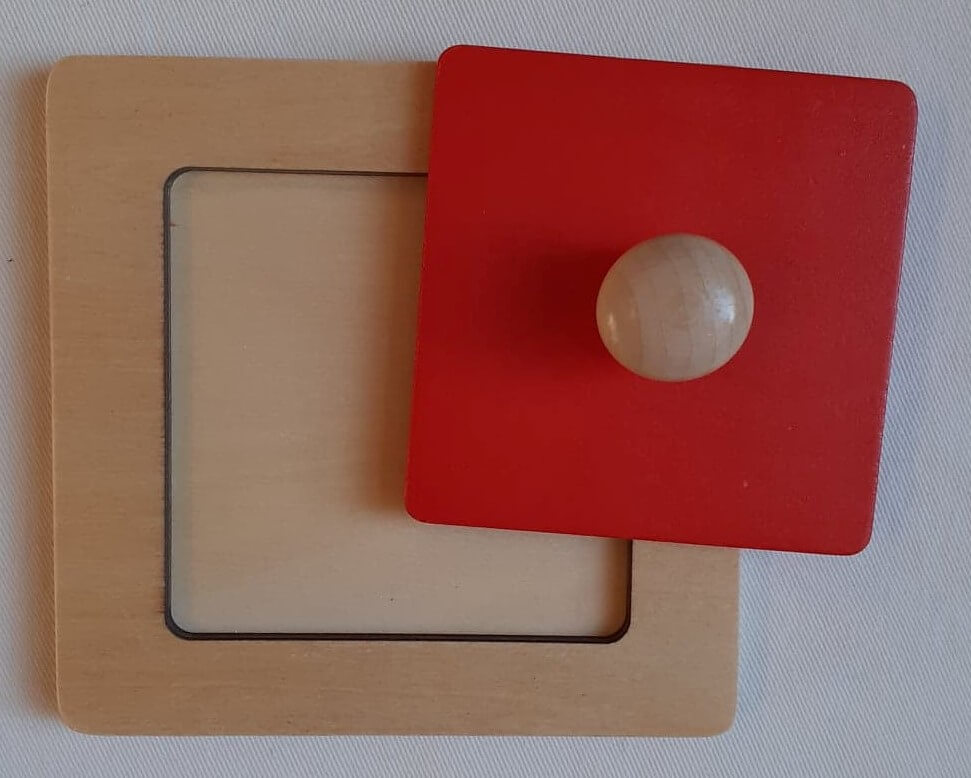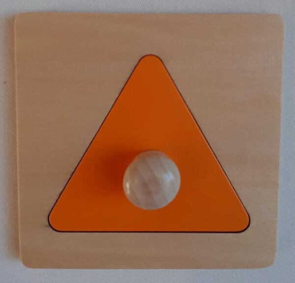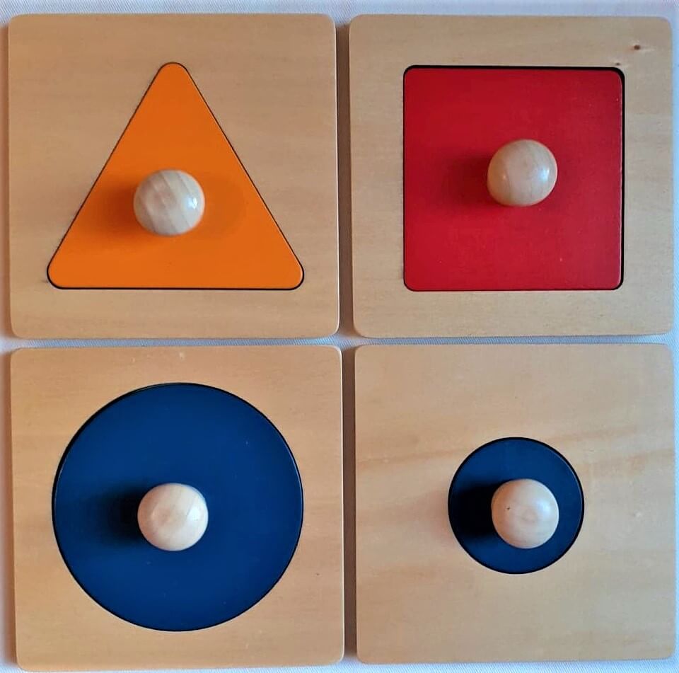 Klassikalised Montessori kujundipusled, eraldi 4 kujundit – kolmnurk, ruut, suur ja väike ring.
