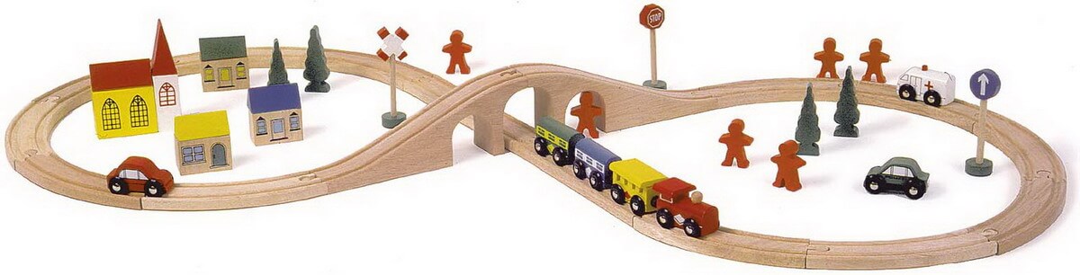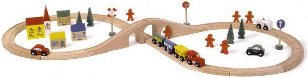 46-osaline raudtee komplekt koos veduri, vagunite ja ümbruses olevada – kaasas on majad, puud, ka autod ja liiklusmärgid.