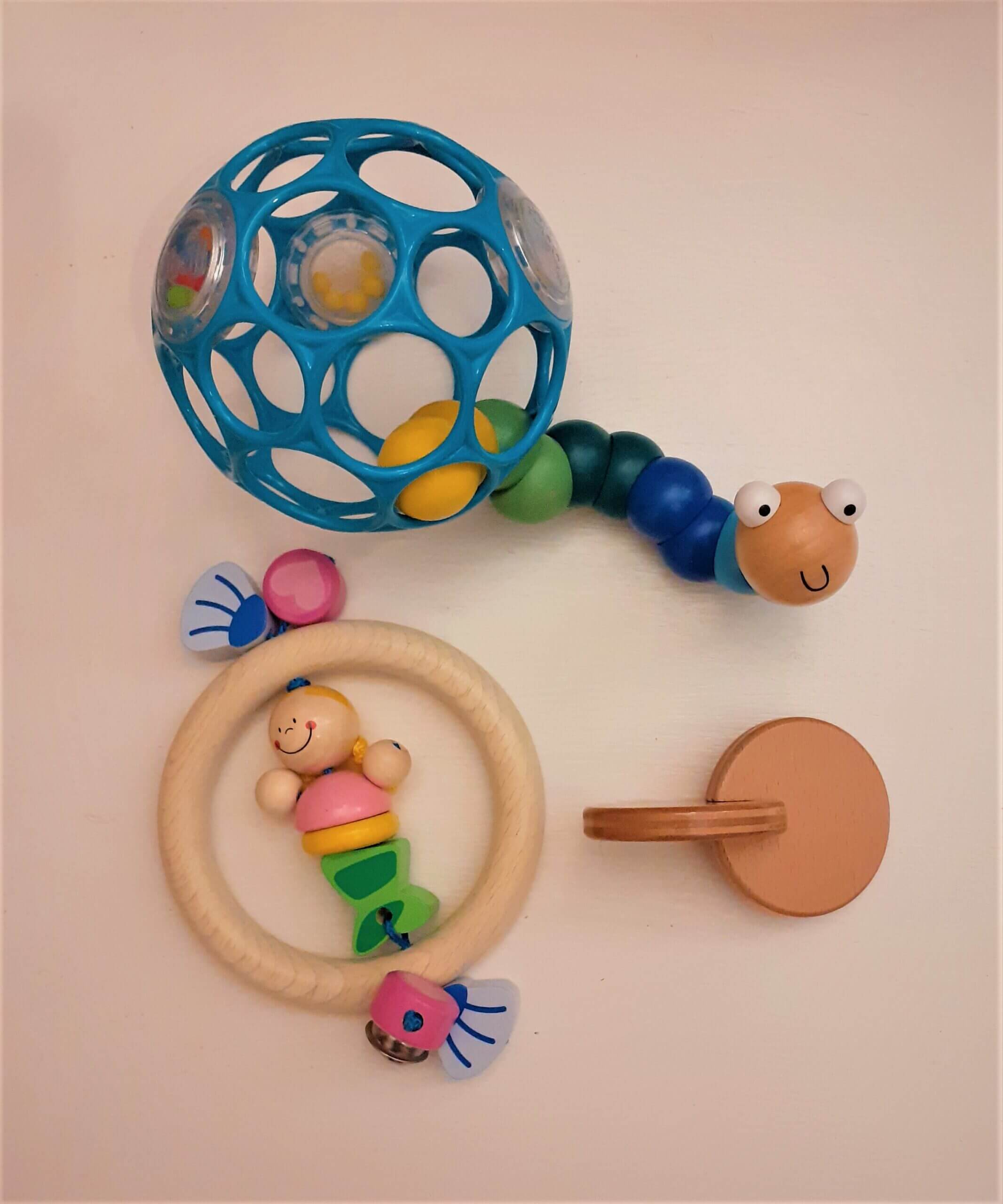 Kompektis: ühendatud kettad (Montessori vahend), haaramispall (The Oball*), painduv ussike ja kõrisev haaramisrõngas (Heimess).