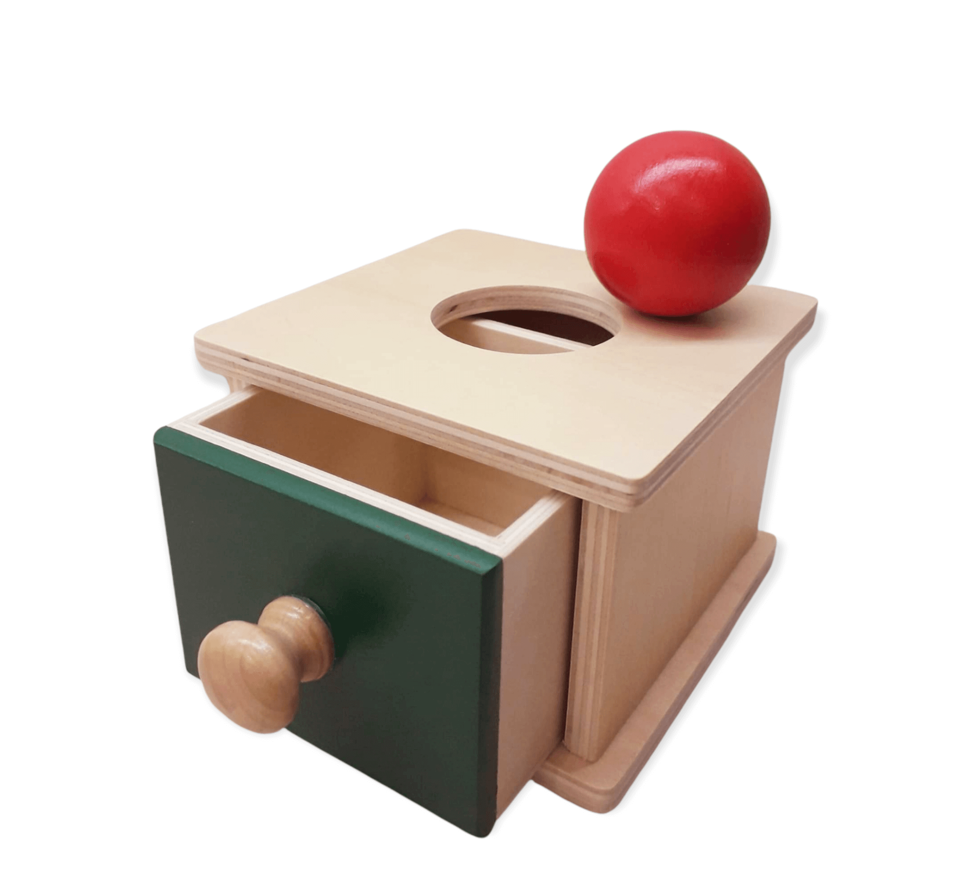 Klassikalise Montessori eseme jäävuse kasti edasiarendus ja lapse jaoks järgmine samm. Pall ei ilmu koheselt nähtavale, vaid lapsel tuleb palli kättesaamiseks avada sahtel.