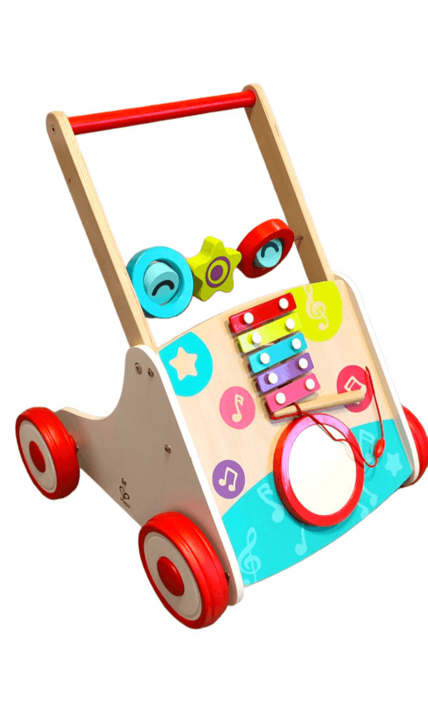 Hape kindel käimistugi, millel saab reguleerida rataste pöörlemise tugevust ja valida kas mängutoosi muusika (lükates tekib heli) või helitu liikumise vahel. Peal on pünevad pillid – trumm ja metallifon.