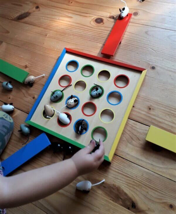 Komplektis: puidust mängualus, 16 hiirt ja 4 hüppelauda.