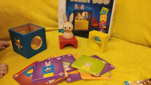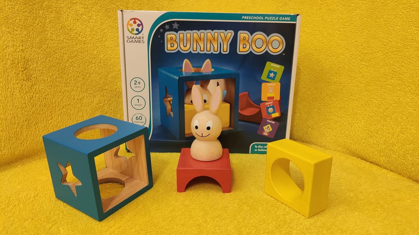 Bunny Boo on vahva mäng, mille käigus laps õpib mõistma asukohamõisteid (peal/all, taga/ees, sees/väljas, nähtav/peidus) tähendust. Nooremal lapsel (2-3 a) aita märgata: Kas jänes vaatab läbi ümara augu või hoopis läbi tähekujulise ava? Kas ta on punase, sinise või kollase tüki peal? Kaartidel on 60 erineva raskusastmega ülesannet, nii päris algajale (2a) kui juba osavamale mängijale.