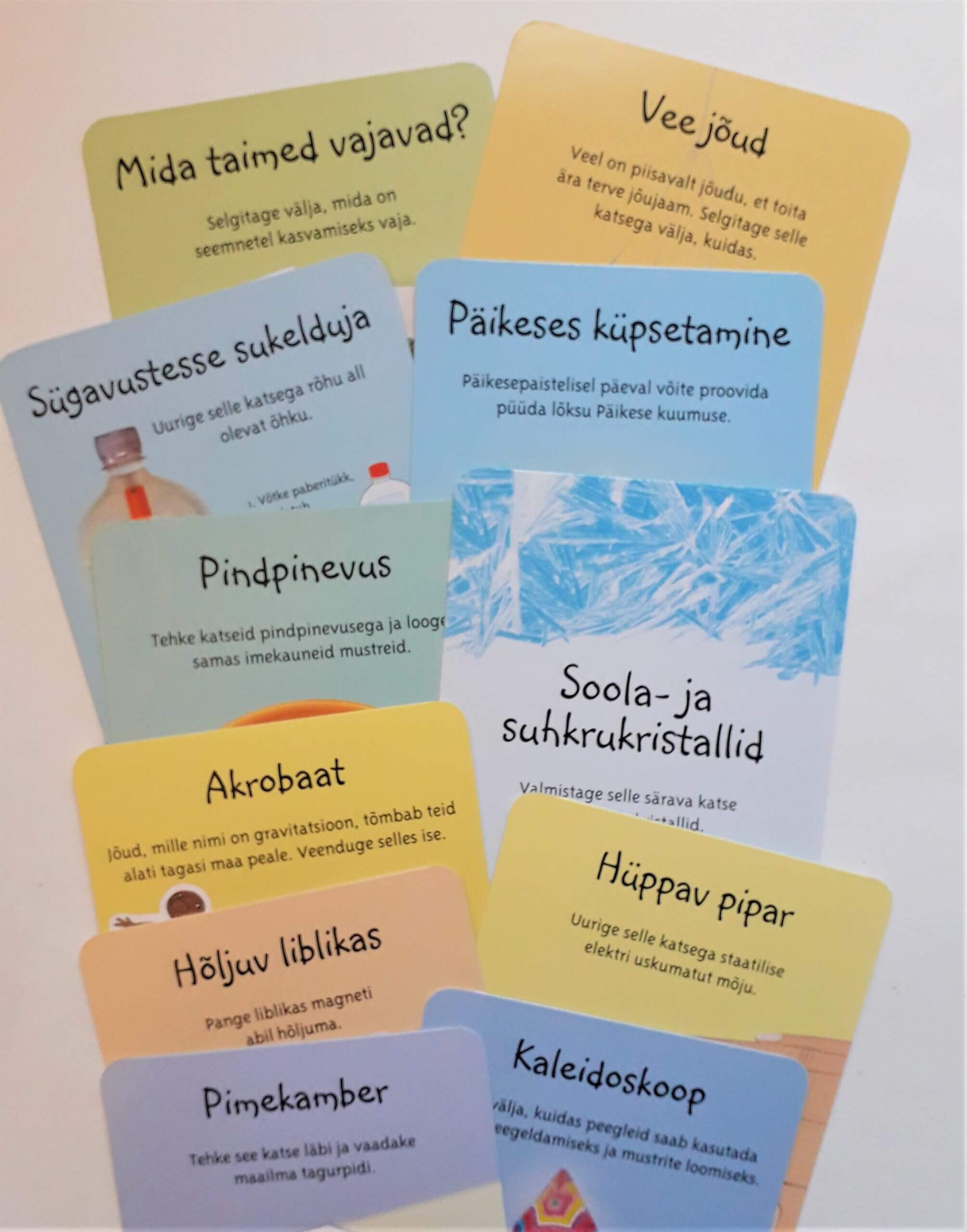 Komplekti on 50 kaarti koos katse täpse kirjelduse ja teadusliku selgitusega.