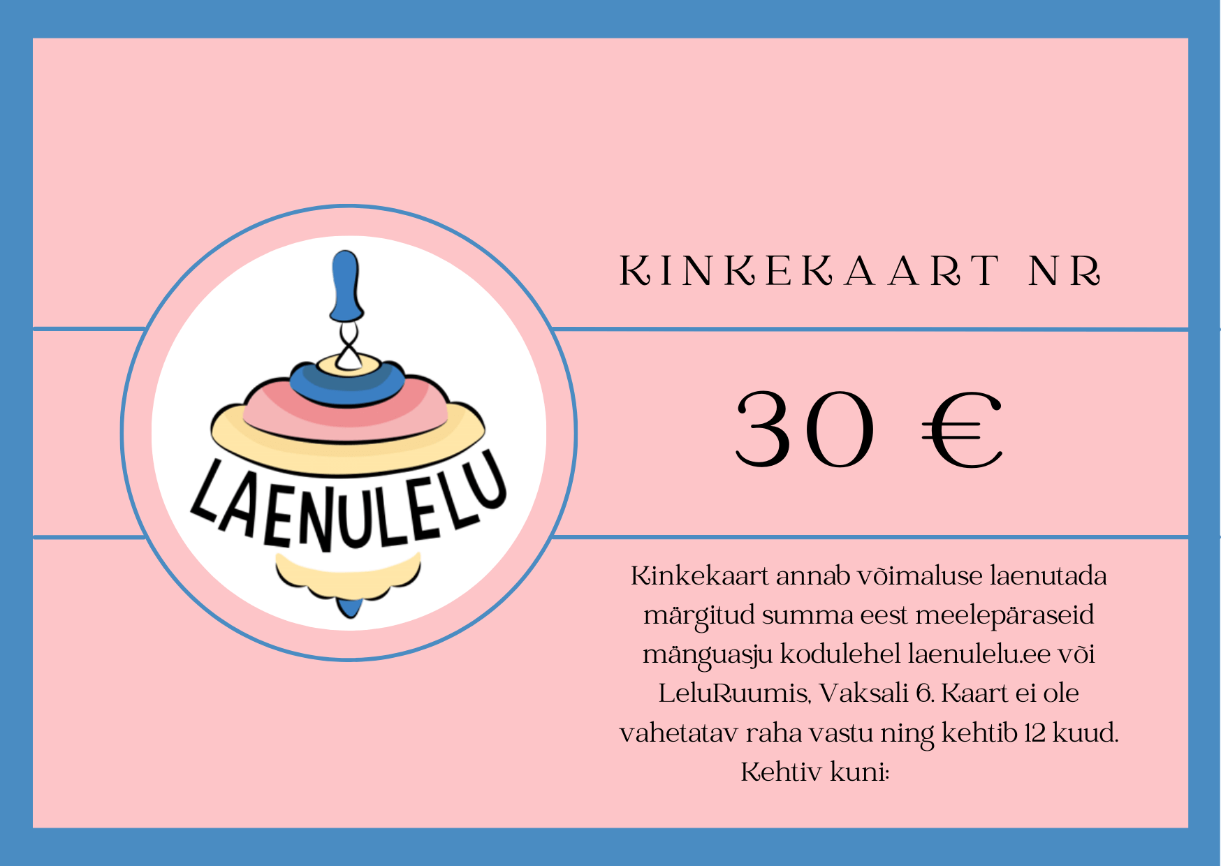 Kinkekaart väärtusega 30 eurot, mis pakub lapsele rõõmu kahel korral – kätte saades saab kaardil olevaid ülesandeid lahendada ja seejärel märgitud summa eest mänguasju laenutada (kodulehelt laenulelu.ee või LeluRuumist, Vaksali 6, Tartu)