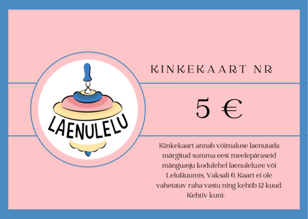 Kinkekaart annab võimaluse laenutada märgitud summa eest meelepäraseid mänguasju kodulehel laenulelu.ee või LeluRuumis, Vaksali 6. Kaart ei ole vahetatav raha vastu ning kehtib 12 kuud.