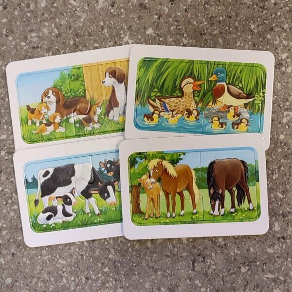 Kahe-tükilised koduloomapiltidega 9 puslet. Soovi korral saab pusle panna ümbrise sisse.
