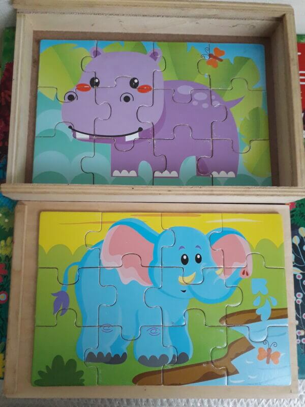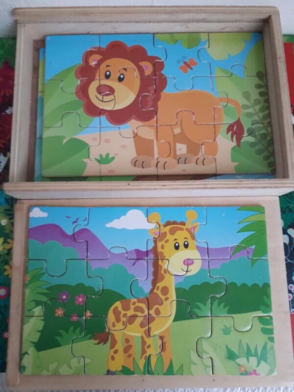 Puidust 12-tükilised loomapiltidega pusled puidust karbis.
