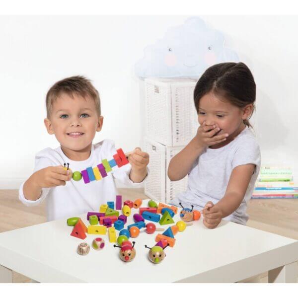Tõeliselt põnev mäng, mida saab varieerida vastavalt vanusele. Nooremad saavad teha ussikesi, lükkides kujundeid nööri otsa või sorteerida värvide/kujundite alusel. Vanemad lapsed oskavad mängida nii vastavalt juhisetele, kuid ka ise luua oma mänguversiooni, sest varieerimisvõimalusi jagub. Tore (ja samas mitte liiga ajamahukas) ajaviide kogu perele!