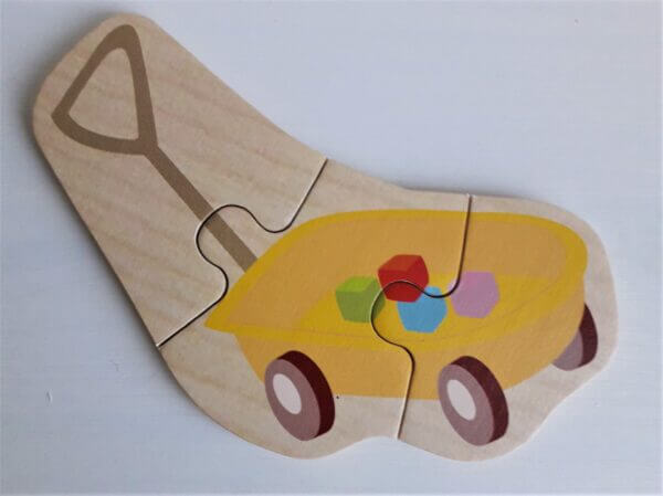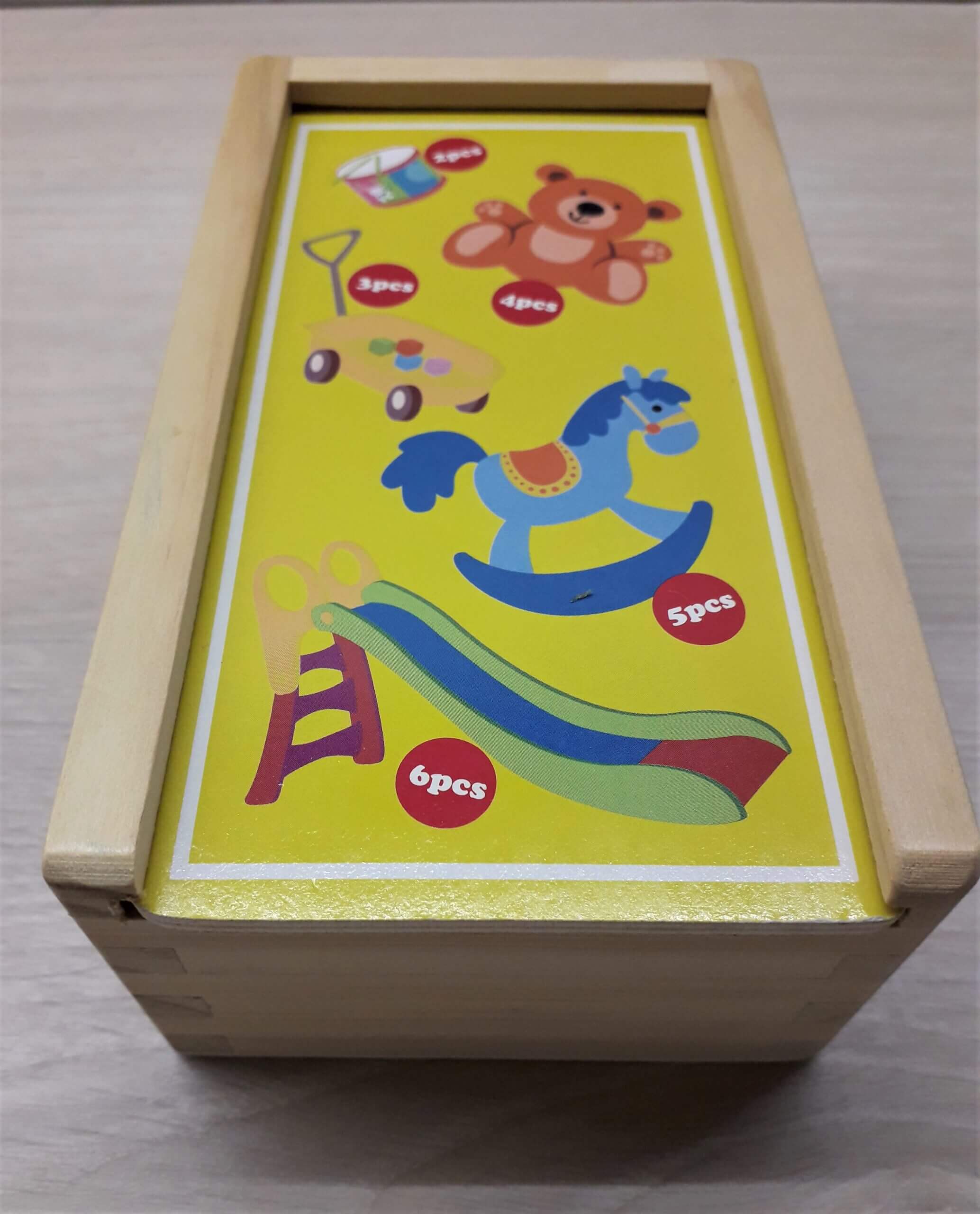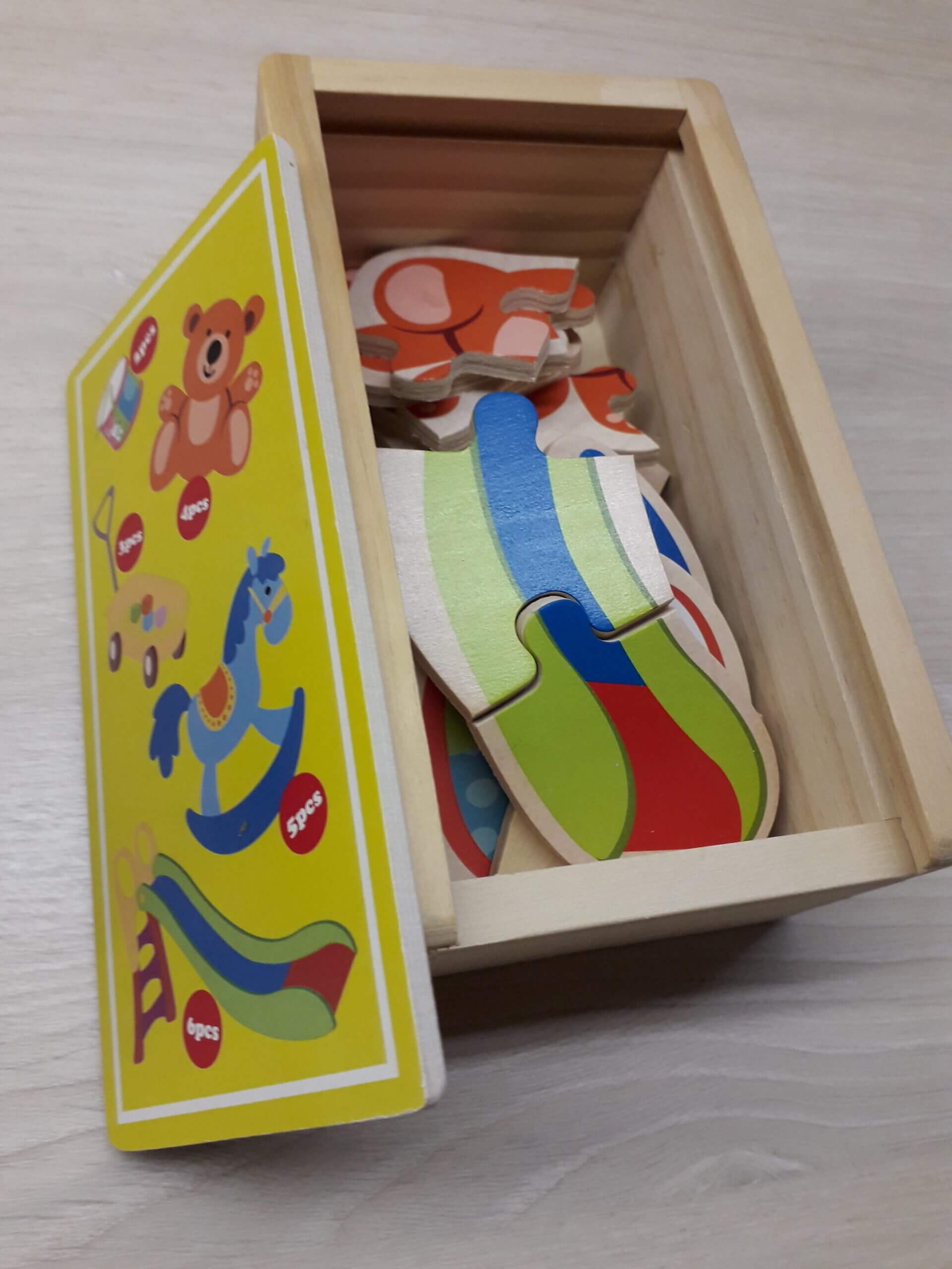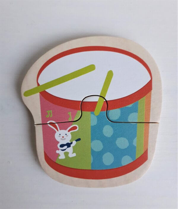 Puidust karbis 5 puidust (Small Foot) pusle, erineva arvu tükkidega. Trumm koosneb kahest tükist, aga liumägi on kuue tükiline. Ideaalne pusle esimesteks puslekatsetusteks!