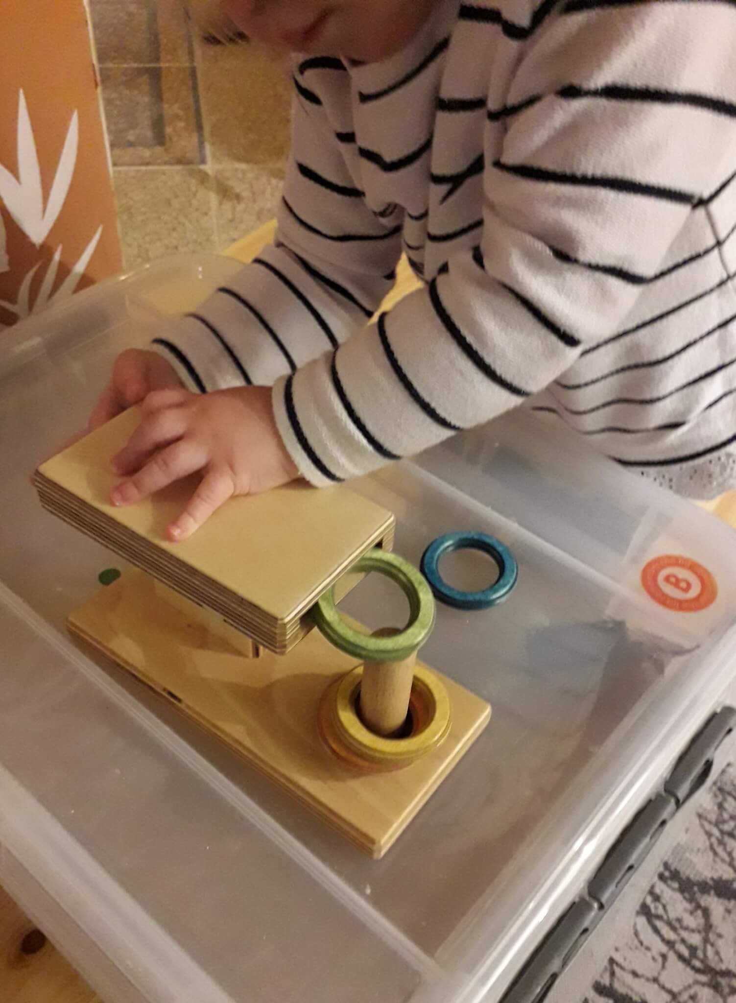 “Rõngad läbi pilu” on Montessorist inspireeritud mänguvahend Läti tootjalt Tapinietas. See on järgmine samm sahtliga eseme jäävuse kastist! Laps paneb rõnga pilusse, aga see ilmub nähtavale (ja kukub rõnga otsa) alles siis, kui järgmine rõngas pilusse panna.