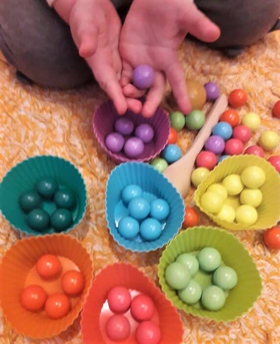 Sorteerimis- ja ladumismäng värviliste kuulidega (läbimõõt 1,5 cm) on peenmotoorikat ja tähelepanu arendav mäng.
