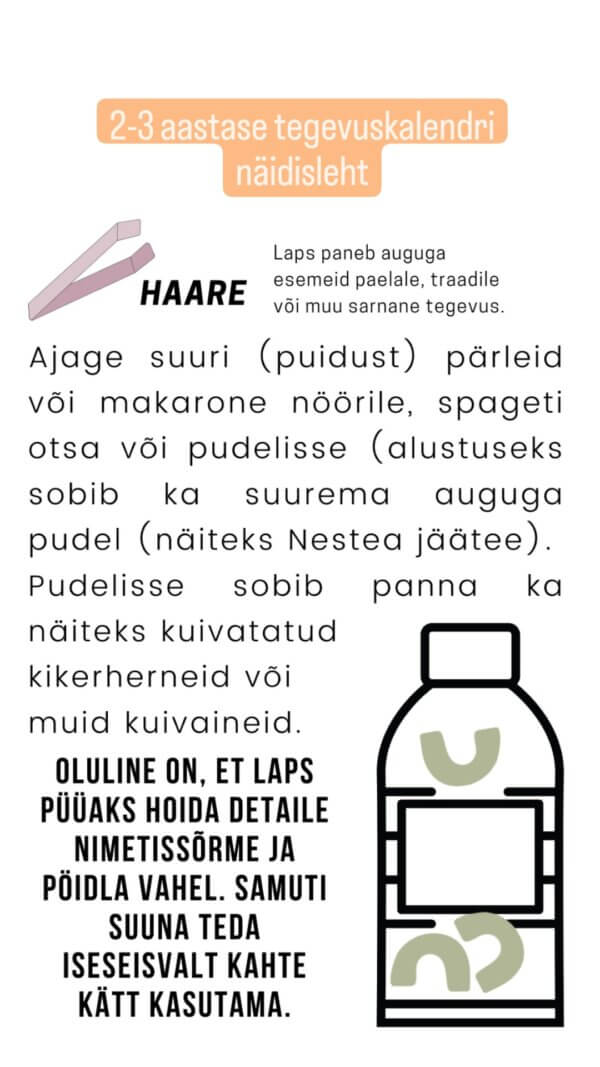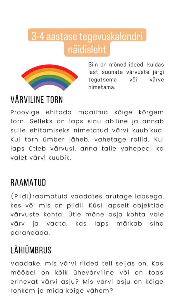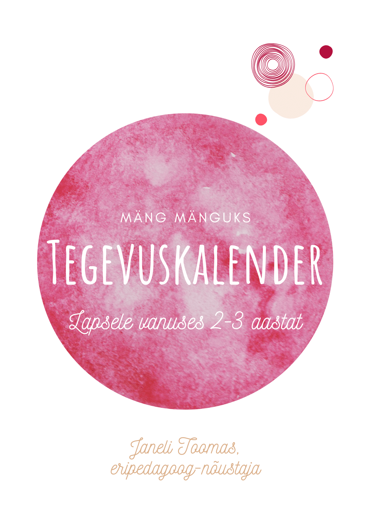 Eripedagoog Janeli Toomas on koostatud lapse arengut toetavate tegevuste kogumikud. Kui kodus jääb ideedest puudu, mida lapsega teha, siis need on ideaalsed abivahendid. Siin on tegevuskalendrid vanusele 2.-3. aastat ja 3.-4.aastat.