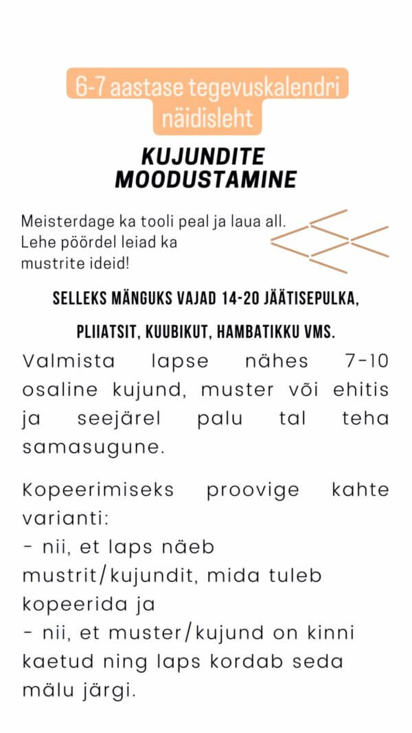 Eripedagoog Janeli Toomas on koostatud lapse arengut toetavate tegevuste kogumikud. Kui kodus jääb ideedest puudu, mida lapsega teha, siis need on ideaalsed abivahendid. Siin on tegevuskalender vanusele 6-7. aastast.